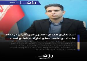 مهدی بکند معاون روابط‌عمومی، تشریفات و امور بین‌الملل استانداری همدان در بخشنامه‌ای به مدیران دستگاه‌های اجرایی، سازمان‌ها، بانک‌ها و دانشگاه‌های استان تأکید کرد: حضور خبرنگاران و اصحاب رسانه در تمامی جلسات و نشست‌های رسمی ادارات بلامانع بوده و باید از آنان، بدون هیچ‌گونه محدودیت یا گزینش، برای پوشش اخبار دعوت به‌عمل آید.