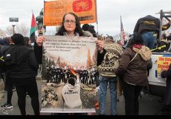 شرکتکنندگان در این تظاهرات پلاکاردهایی را حمل میکردند که بر روی آنها نوشته شده بود: «جنبش بومیان آمریکایی», «از بین نرفتهایم، ما اینجا هستیم قوی و بیدار», «همدردی و حمایت سفیدپوستان از بومیان و آزادی آفریقائیان», «اروپاییان مهاجران غیرقانونی هستند؟», «روز ملی عزای عمومی».