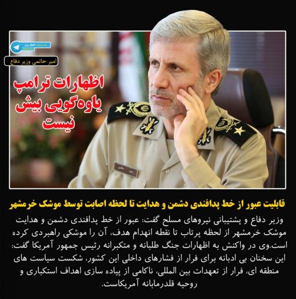 امیر سرتیپ امیر حاتمی وزیر دفاع و پشتیبانی نیروهای مسلح درآغاز هفته دفاع مقدس با بیان اینکه افتخار میکنیم صنعت دفاعی کشور ما کاملاً بومی است، افزود: انواع موشک ها و تجهیزات رزم زمینی، پدافند هوایی و سامانه های رزم دریایی کاملاً ایرانی است و متخصصان پا در رکاب ما این راه را همچنان با قدرت ادامه می دهند