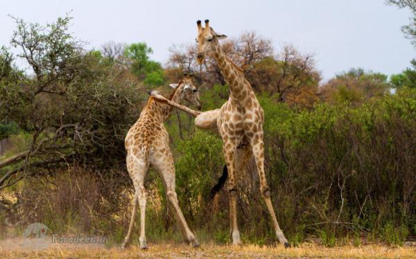به گزارش فرادید، "توماس رتره" عکاس 56 ساله آلمانی در جریان بازدید و گشت و گذار در پارک ملی بوتسوانا در حالی از جنگ دو زرافه عکاسی کرد که یکی از آنها پاهایش را به اندازه باورنکردنی بالا آورده و به دیگری ضربه می زد.